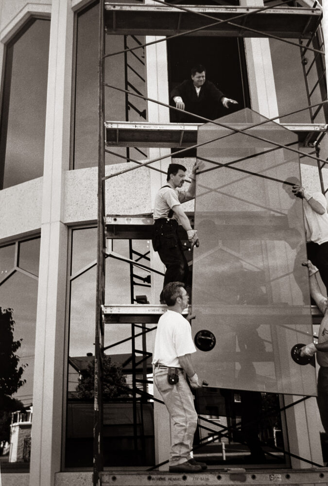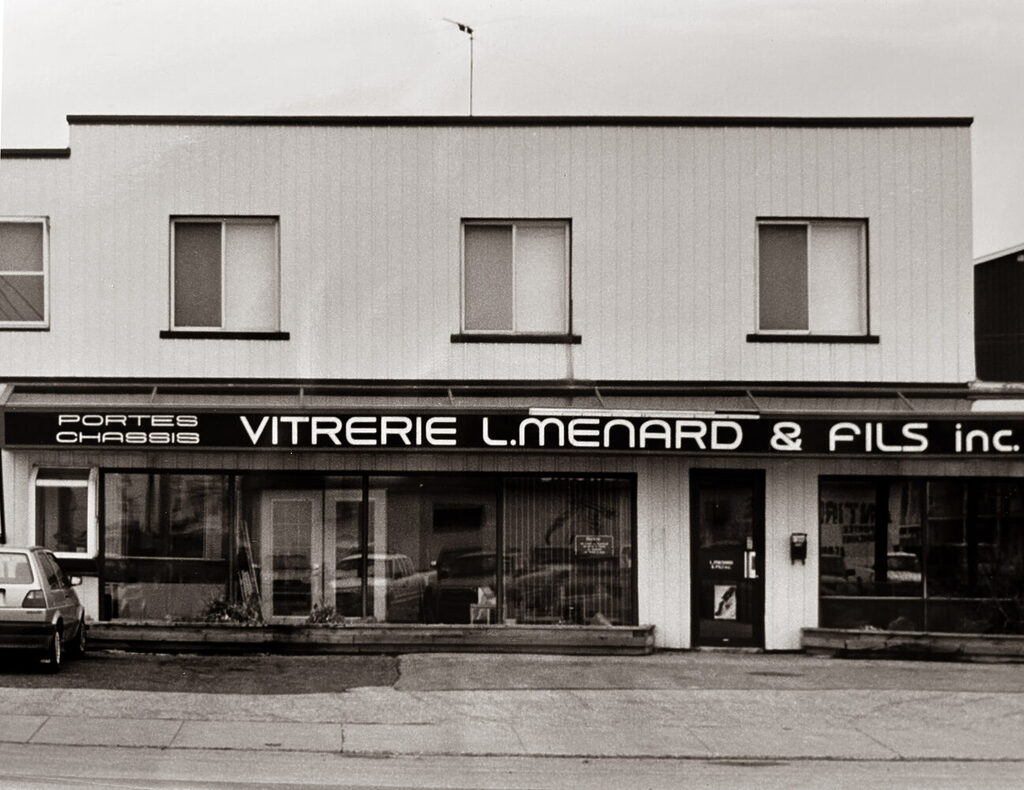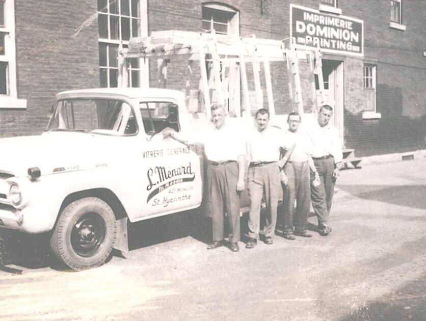 C’est en 1949 que Lucien Ménard fonde la vitrerie L. Ménard & Fils, sur la rue Mondor à Saint-Hyacinthe. À cette époque, les vitrines commerciales se composaient de grandes vitres simples, tandis que les maisons étaient équipées des fameux châssis de bois, patiemment calfeutrés au mastic. Avec son savoir-faire et sa détermination, Lucien décroche rapidement d’importants contrats industriels, comme la fourniture des 2 000 vitres de l’usine Goodyear et de la Penmans.
